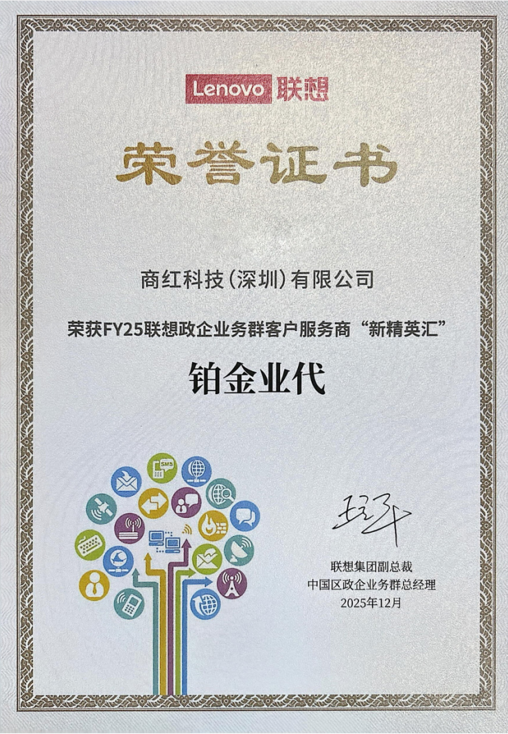 近日,商红受邀参与联想 FY25 政企业务“新精英汇”会议,此会议以 “同心同行,领跑AI普惠新时代” 为核心,聚焦行业前沿动态、产品创新应用及服务升级方向,为联想优秀合作伙伴搭建了高效的交流与成长平台。商红凭借联想高级别正规服务商资质,以及技术与服务领域的卓越表现,长期稳居核心合作伙伴阵营,此次出席并荣获“铂金业代”,亦是联想对商红的高度认可。